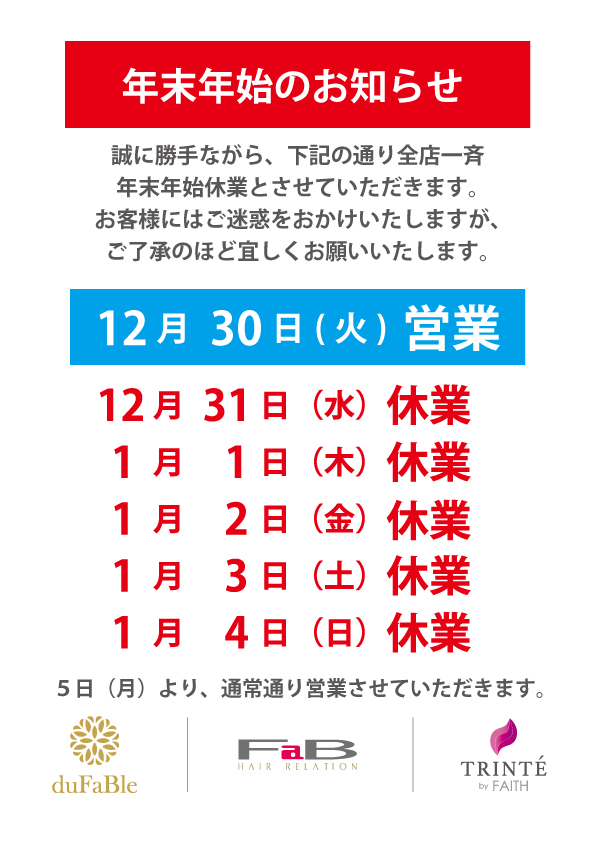 誠に勝手ながら、下記の通り全店一斉、下記の通り年末年始休業とさせていただきます。